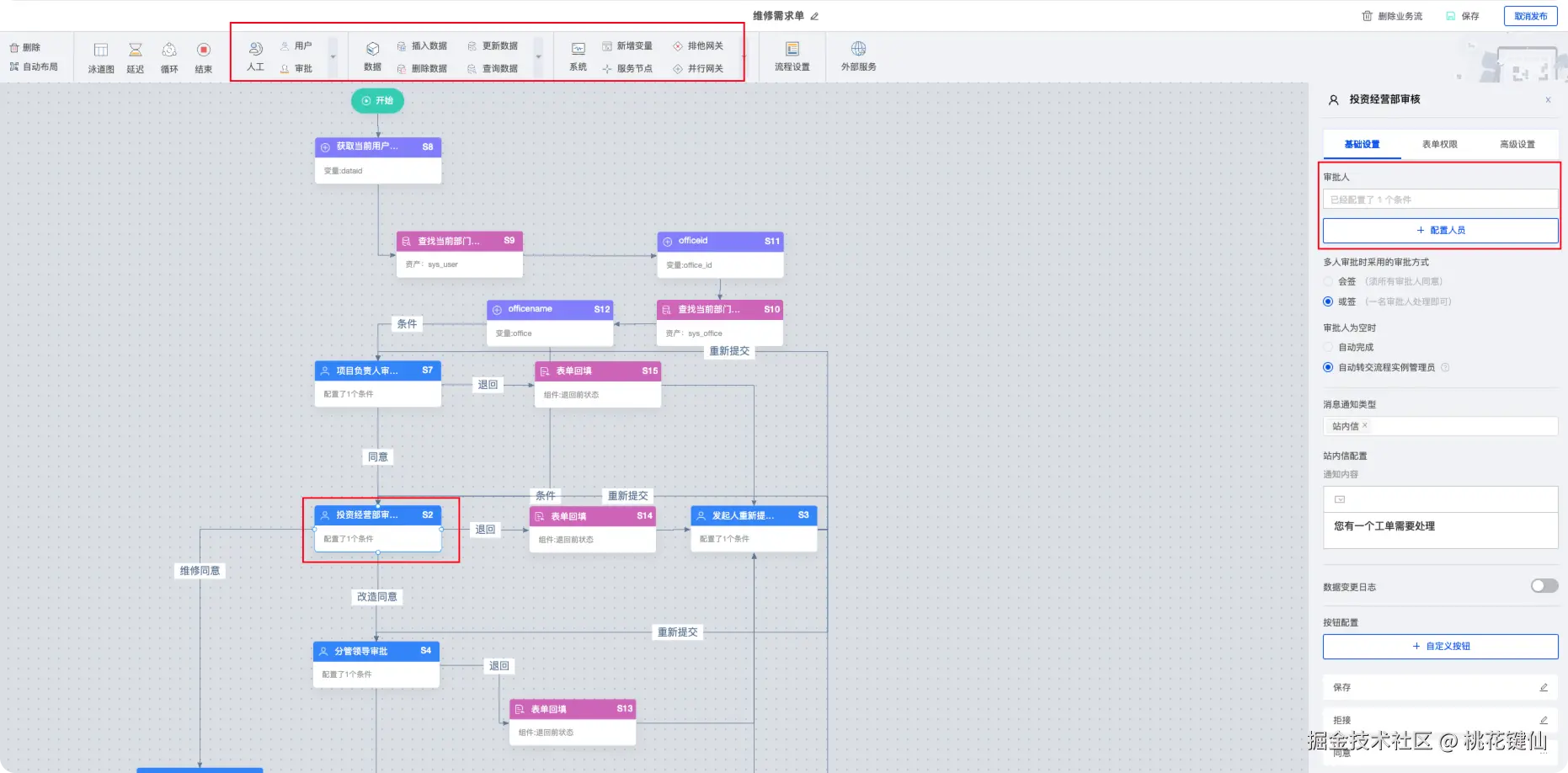 第一步我们通过数据查询组件实现用户信息获取;第二步拖入人工组件配置多级领导审批,分别配置同意和退回两条条件线路;第三步进行流程梳理连接,同意则流程继续流转至下一节点,退回则拖入数据中表单回填组件与其连接,实现退回重新提交等操作,以此落实无码化园区多商场和多店铺的数字化管理。