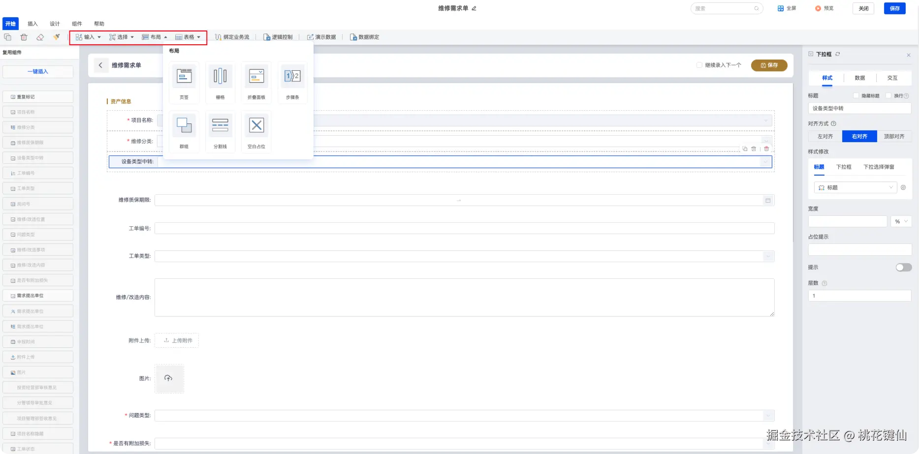 前面相对聚焦整个商管平台的搭建,对于资产、合同、工单等模块应用,基本都是由表单、列表、详情页等组合而成。像工单中的维修需求表单,利用了布局群组组件,以及文本、日期、下拉框、文件上传、图片上传组件拖入拼装完成,而表单基础的必填、禁填、文件上传大小都可以直接勾选配置。
