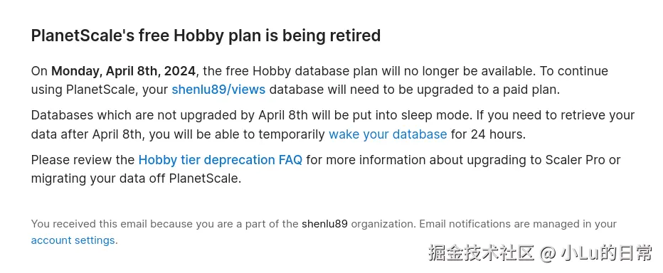 昨天收到 PlanetScale 发来的邮件,从2024年4月8日起,将不再提供免费的 Hobby plan 了。