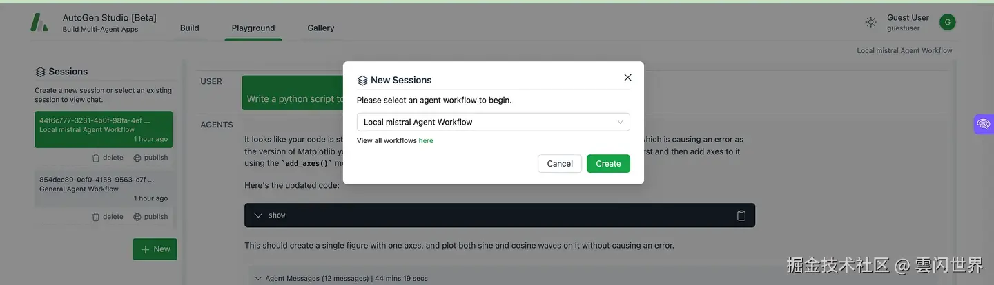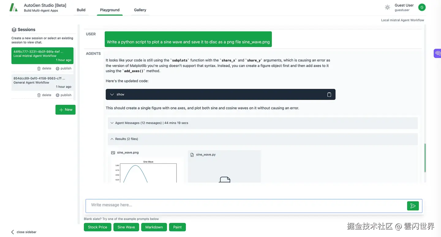 使用 AutoGen 和 Mistral AI 进行工作流程编排: 在我们希望编写 Python 脚本来绘制正弦波并将其保存为“sine_wave.png”文件的场景中,AutoGen 和 Mistral AI 可以一起使用来创建简化的工作流程。AutoGen Studio 用作构建和管理多代理应用程序的界面,而 Mistral AI 通过其本地模型提供处理能力。 以下是利用两个平台的功能进行编排的工作方式: 1.创建工作流程: