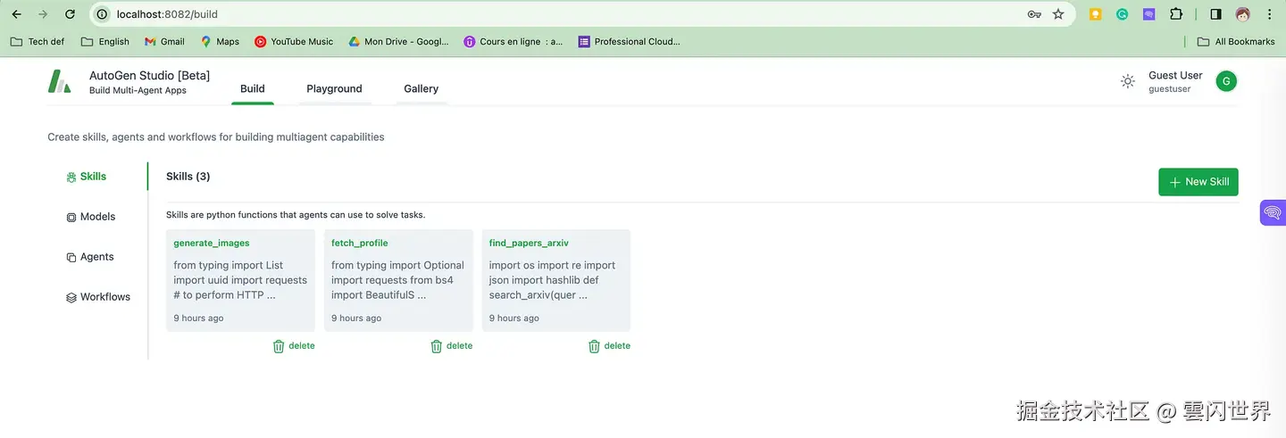 AutoGen Studio 提供简化且用户友好的界面,方便创建和管理多代理 AI 应用程序。界面分为几个部分,包括技能、模型、代理和工作流,每个部分在应用程序开发中都发挥着不可或缺的作用。 技能 在技能部分,用户可以开发和存储代理将用来解决任务的 Python 函数。这是一个定义和完善应用程序功能的编程环境。