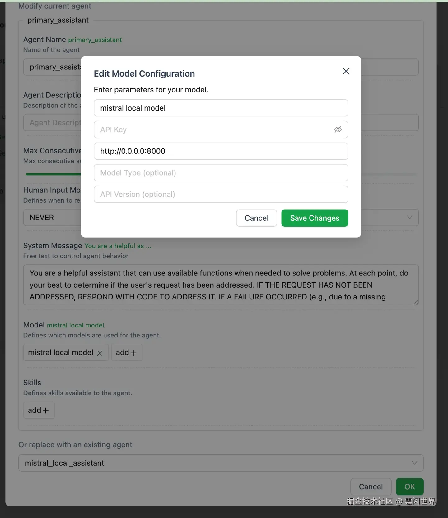 - 模型的 API 端点将配置为 Mistral AI 正在运行的本地服务器地址(例如,http://0.0.0.0:8000)。