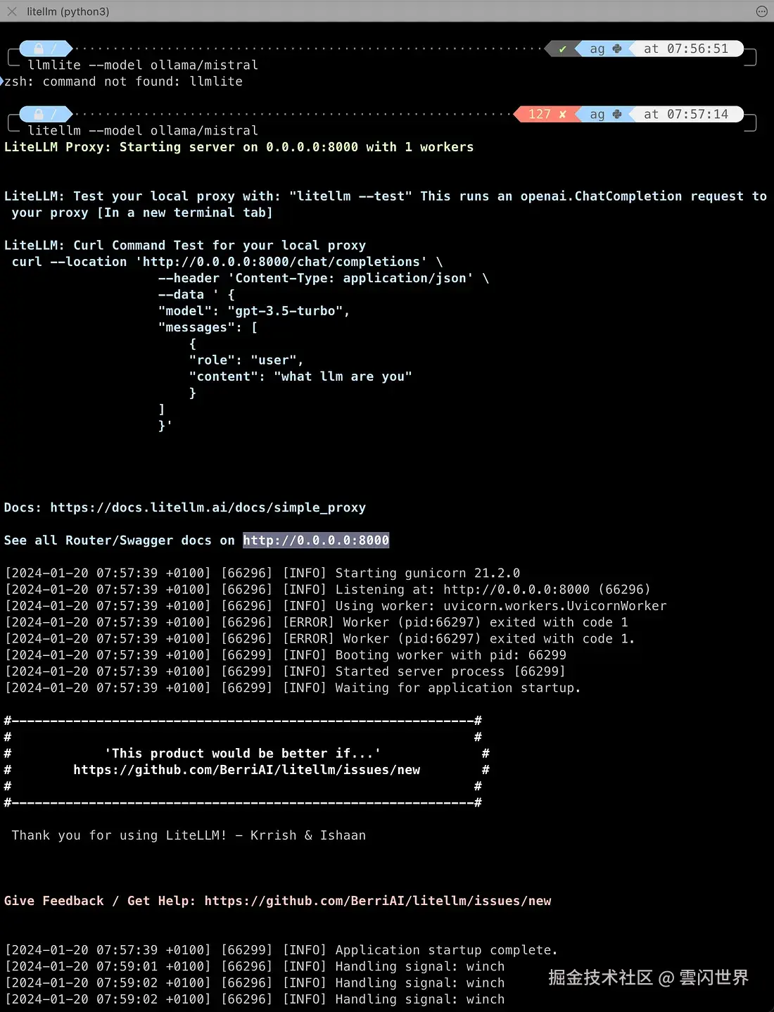 - 运行 Ollama Mistral:在 Ollama 平台上执行以下命令启动 Mistral 模型,使其准备好处理请求。此命令初始化设置模型的进程,加载必要的数据,并启动处理查询的服务。 奥拉马河米斯特拉尔河 2. 安装 LiteLLM:LiteLLM 库是一种便于从 http 端点运行语言模型的工具。安装或升级 LiteLLM 可确保您拥有最新版本的库,这对于兼容性和功能性来说非常重要。 pip 安装 litellm——升级 3. 安装 Gunicorn:Gunicorn 是用于 UNIX 系统的 Python WSGI HTTP 服务器,用于运行 Python Web 应用程序。它是运行 LiteLLM 代理的先决条件,允许您向语言模型发出本地 HTTP 请求。 pip 安装 gunicorn 4. 使用 Ollama/Mistral 模型运行 LiteLLM:此步骤实际上初始化模型并使其准备好运行。此命令告诉 LiteLLM 使用 Ollama 提供的 Mistral 模型。它为交互准备模型,允许您开始进行查询和接收响应。 在此过程结束时,本地 Mistral 模型从 0.0.0.0:8000 启动,有 1 名工作人员。 litellm——模型ollama/mistral 这些步骤中的每一个都是设置一个完整的工作环境所必需的,在这个环境中,AI 模型可以在本地进行交互。这种本地设置允许开发人员测试和集成 AI 模型,而无需不断与云服务通信,这有利于提高开发速度、离线功能和节省 API 调用成本。