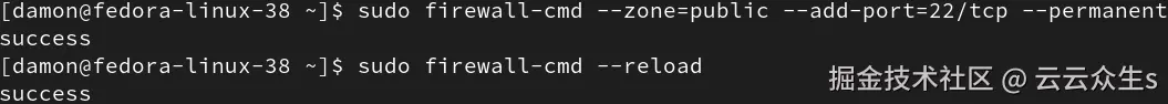$ sudo firewall-cmd --zone=public --add-port=22/tcp --permanent