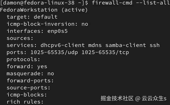图 2:firewall-cmd 命令展示了默认区域的规则。