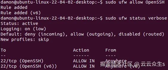 sudo ufw allow OpenSSH - 查看更新后的规则: