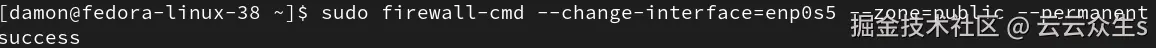 $ sudo firewall-cmd --change-interface=enp0s5 --zone=public --permanent
