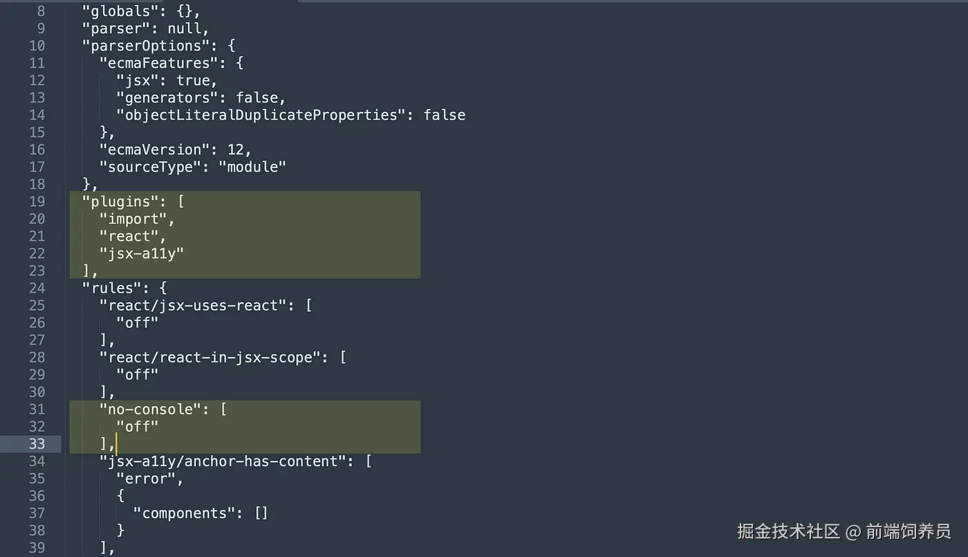 例如,在上面示例的 .eslintrc.js 中,可以看到 plugins 配置项只写了 react ,而实际上它完整的包名称是 eslint-plugin-react , eslint-plugin-* 的部分可以省略:
