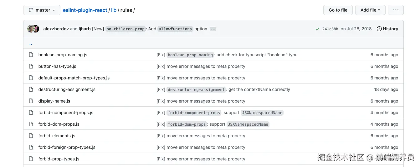 以 eslint-plugin-react 为例,可以看到这里定义好了一系列可以被 ESLint 使用的规则: