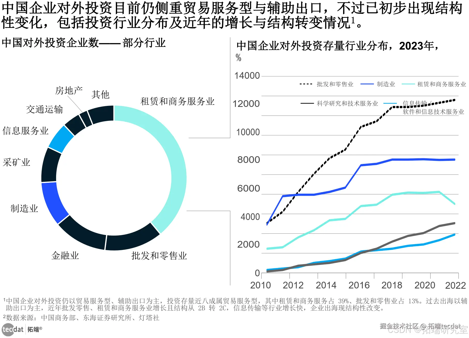 - 依据投资行业进行划分,中国对外投资存量中将近八成属于贸易服务型,其中租赁和商务服务占比 39%,批发和零售业占比 13%。前者主要通过在海外设立贸易办事处来负责接单与售后工作,后者则大多在海外创建进出口贸易公司,以辅助进出口以及开展批发零售业务。就此而言,过往中国企业的出海活动仍然是以辅助企业出口作为主导。