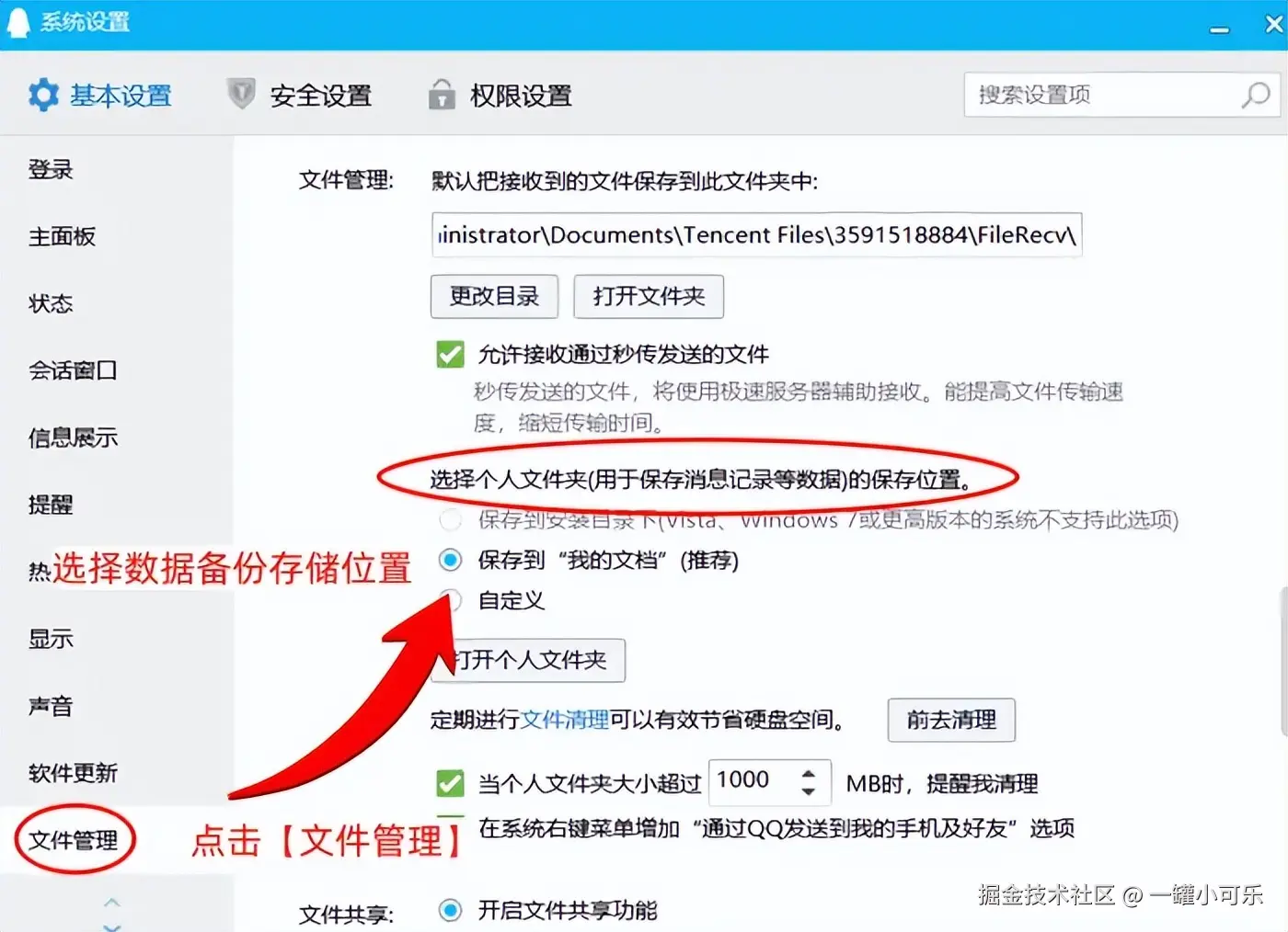 步骤1:打开QQ设置的菜单界面,选择 【文件管理】 选项。