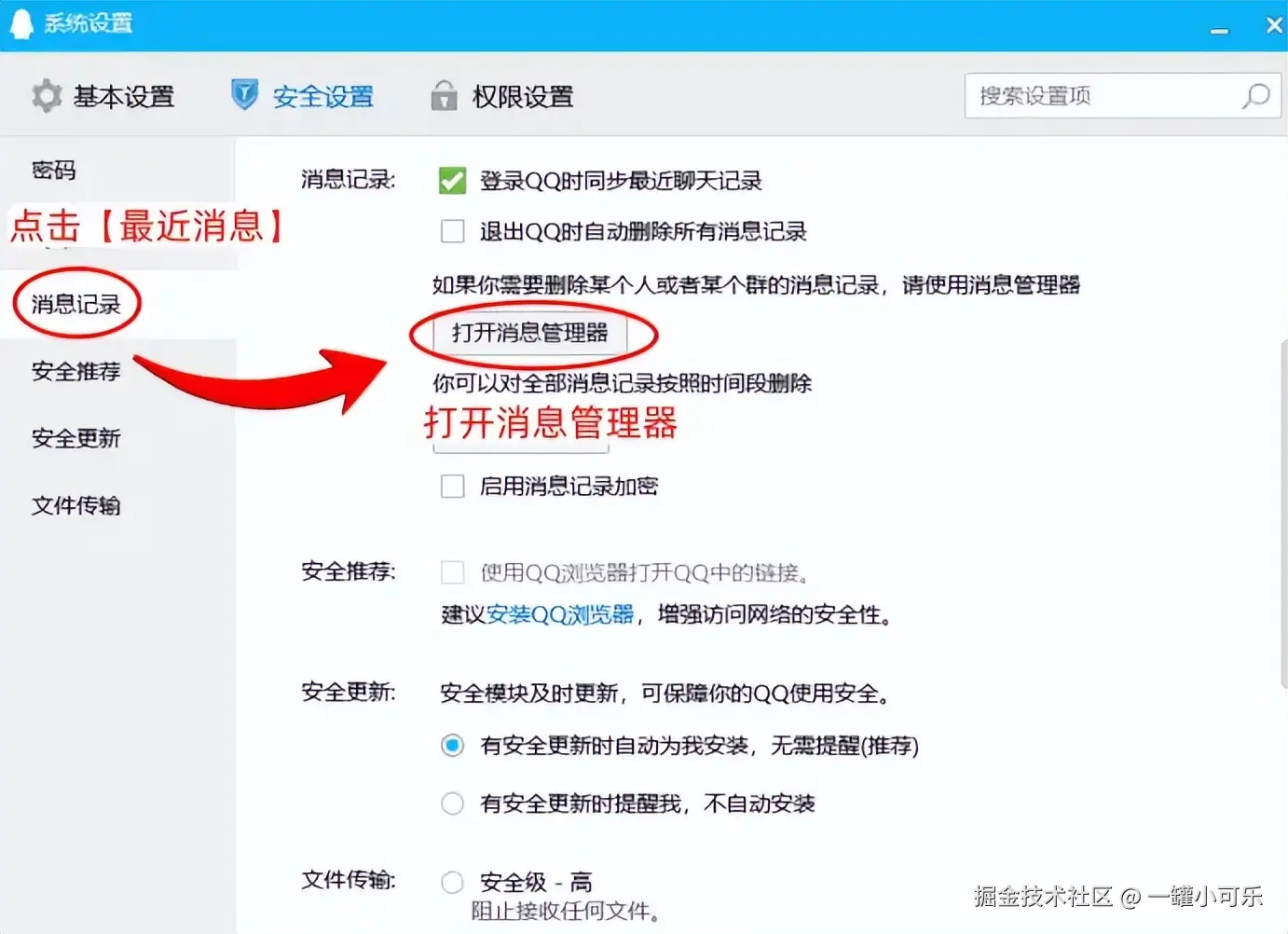 步骤1:点击QQ设置,在系统设置界面中选择 【消息记录】 ,依次点击 【安全设置】-【打开消息管理器】 。