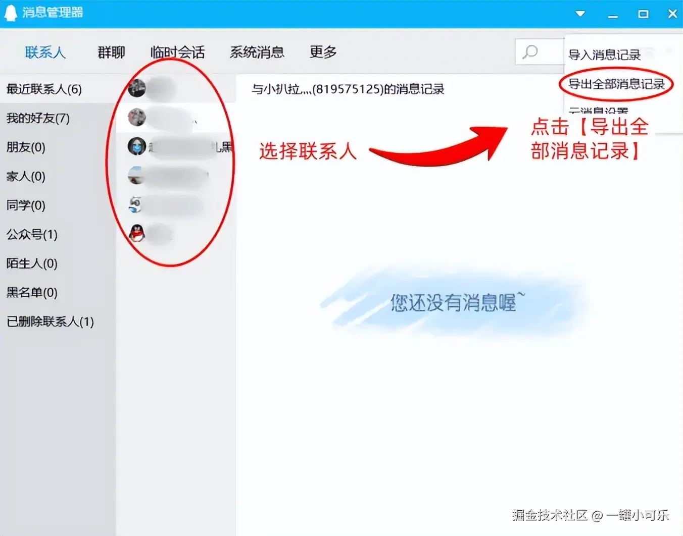 步骤2:在消息管理器界面选择联系人,点击界面上方的倒三角标志,点击 【导出全部消息记录】 即可。