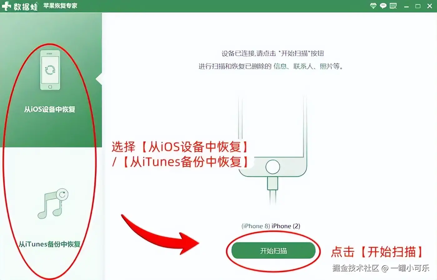 步骤1:打开软件,根据设备情况,选择 【从iOS设备中恢复】或者是【从iTunes备份中恢复】,并点击【开始扫描】。