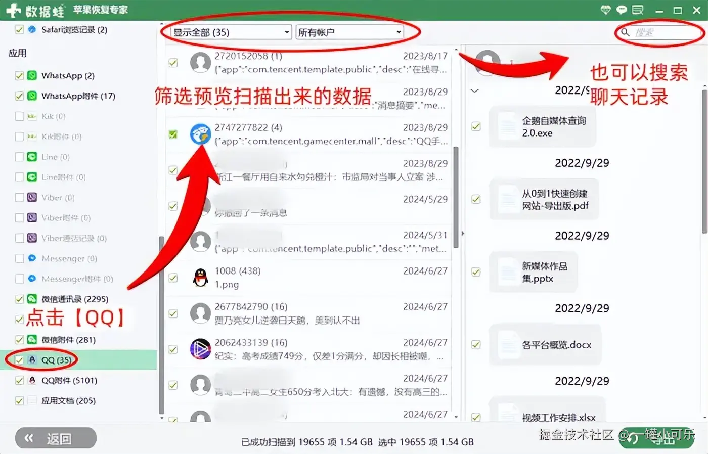 但数据 蛙 苹果恢复专家则可以凭借其强大的数据扫描能力,尽可能地突破时间的限制,帮助用户最大限度地导出聊天数据,将其备份到电脑上。所以,选择这个工具备份QQ聊天数据的效果或许会优于其他方法。