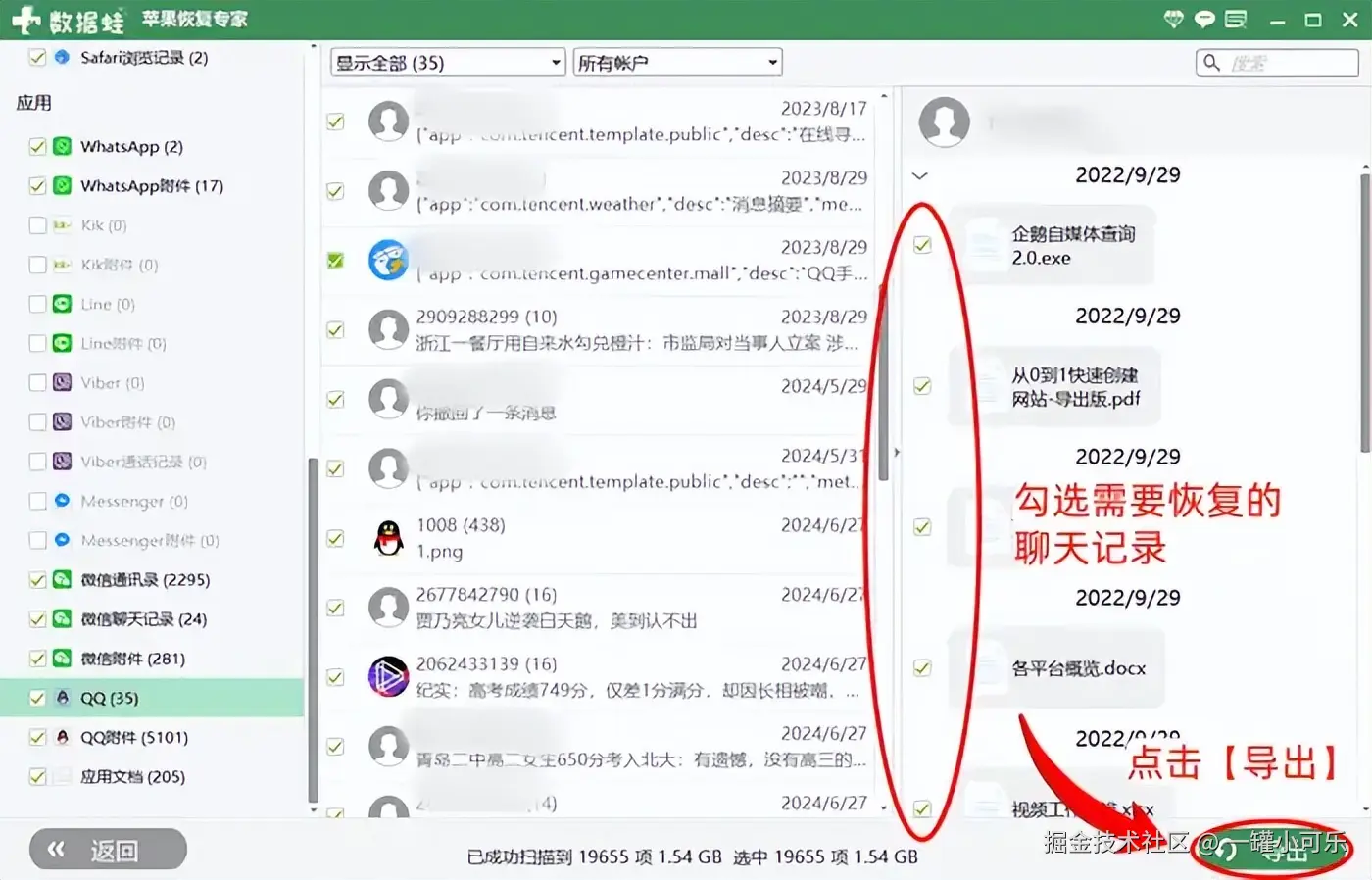 步骤3:预览结束后,勾选可备份的QQ聊天记录,确认选择数据后,点击【导出】,等待数据的备份完成,即可在存储文件中找到备份的聊天记录。