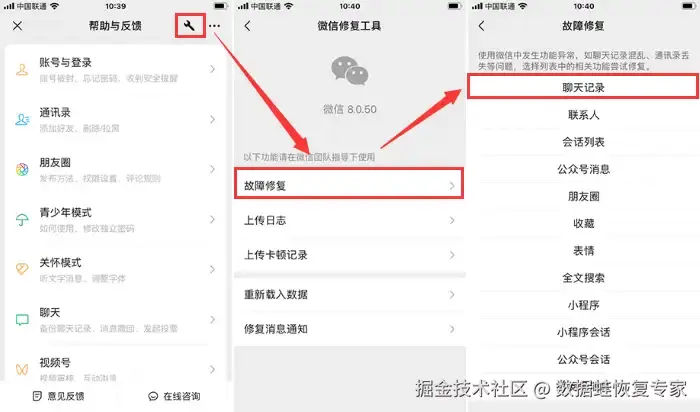 微信内置的 【故障修复】 功能主要用于修复聊天记录、联系人等异常情况,但在某些情况下也可能帮助恢复部分丢失或损坏的文件。具体操作是:打开微信,点击 【我】>【设置】>【帮助与反馈】>【扳手】图标>【故障修复】>选择【聊天记录】 尝试进行修复。