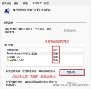 第三步: 检查是否开启“系统保护”,如开启,点击“配置”进入下一步操作,设置电脑还原点。