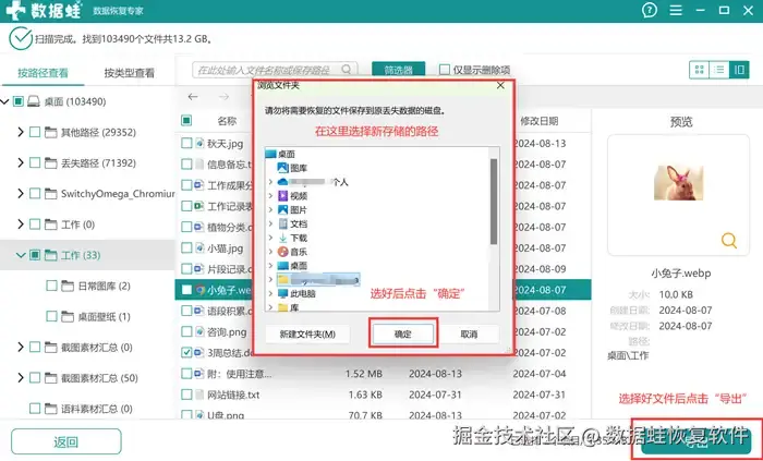 第四步: 找到需要恢复的文件后勾选好,点击“导出”,再把新存储位置选择好即可。