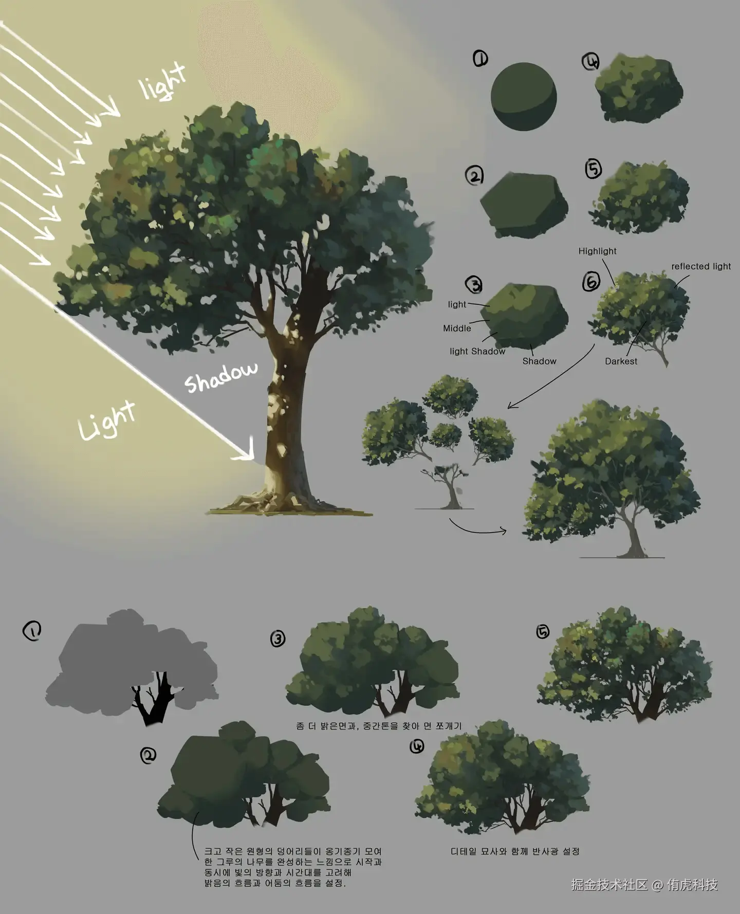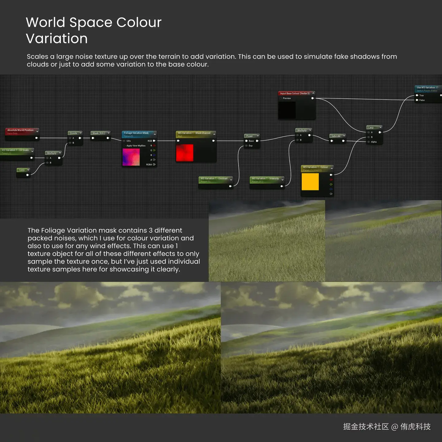 作者的思路是通过距离渐变遮罩加深草靠近根部的颜色,或者加深树冠内部的颜色。