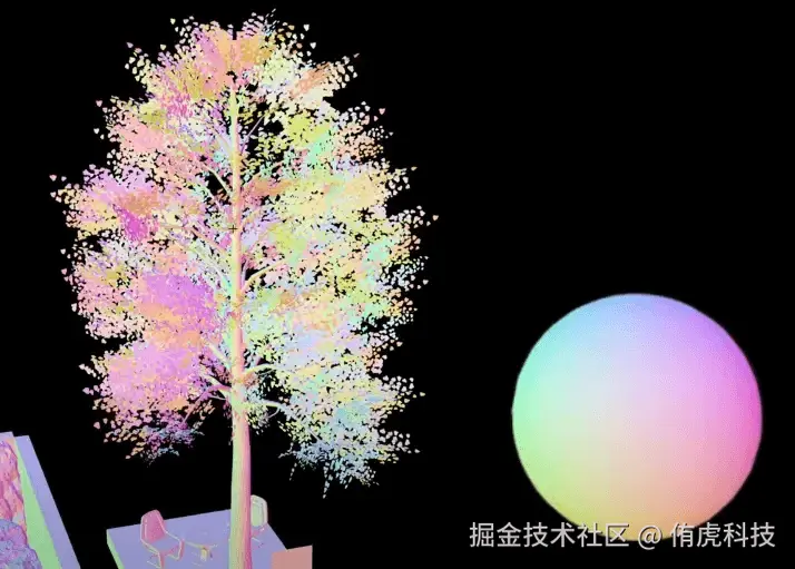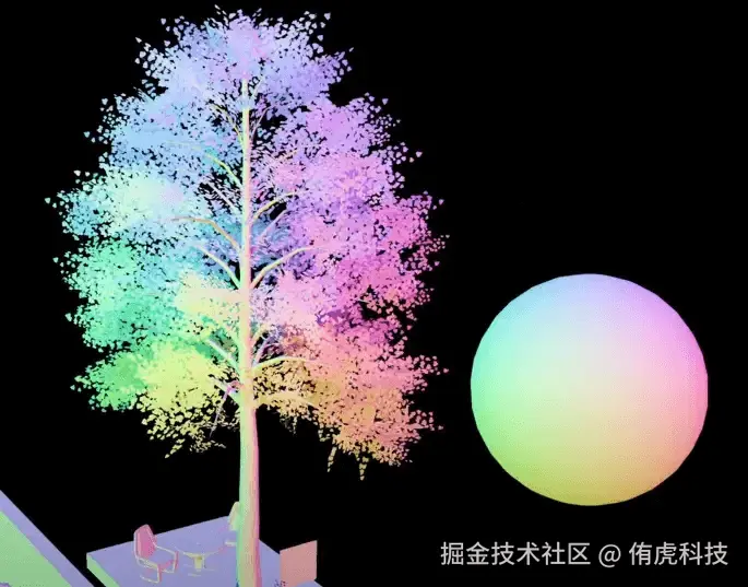 这么做的原因是植物模型,不论是草还是树,大多是平坦的面片穿插而成。如果保持使用单个面片原本的法线,当我们从整体的角度看这个模型时模型的法线将非常凌乱且不符合自然规律,进而光照模型得到的光影效果也会很丑。就像我们画画时应该关注整体的画面结构、光影和色彩,而不去过分在意某处细节的正确与否,植物的法线也应该从整个模型的角度观察。