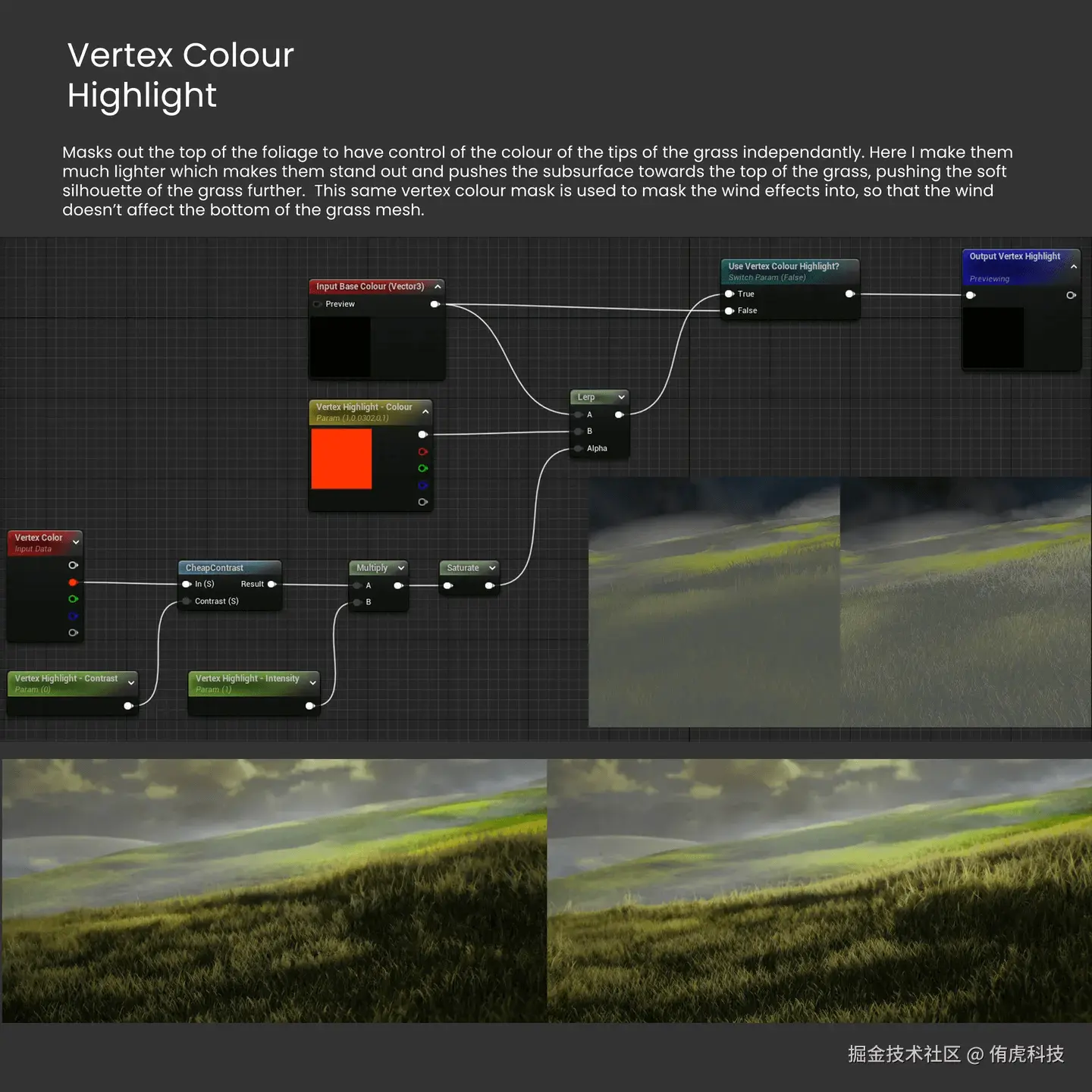 我们的做法是,根据草高光出现的位置用顶点色制作遮罩,结合风效噪声图动态提高颜色亮度(因为高光需要与风浪同步),并与草原本的颜色做混合,如果我们认为高光的亮度不够甚至可以把高光颜色传递给自发光,得到更好看的效果。