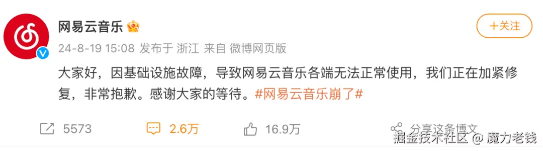 网易云音乐又双叒叕崩了!这次直接冲上了微博热搜第一,网友们纷纷表示:这是不是该给全体用户发一个月的会员补偿了?8月19号,网易云官方赶紧发了声明:因基础设施故障,导致网易云音乐各端无法正常使用。