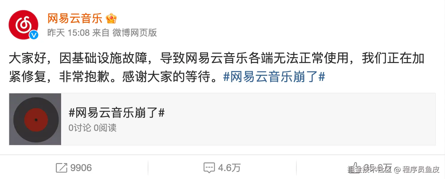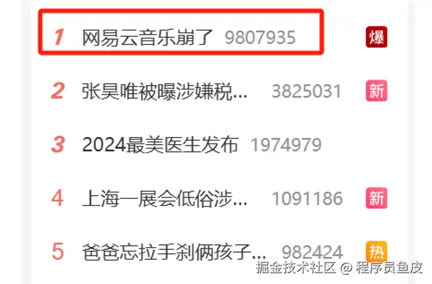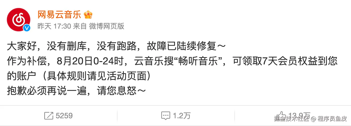 大家好,我是程序员鱼皮,8 月 19 日下午,网易云音乐突发严重故障,并登顶微博热搜,跟黑神话悟空抢了热度。