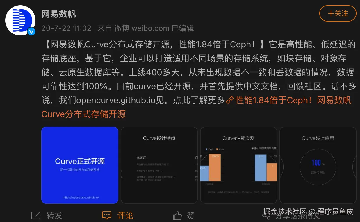 根据网上的消息,这次的故障可能与网易云自研的 Curve 存储系统有关,当时网易官方称该存储系统上线 400 多天,从未出现数据不一致和丢数据的情况,数据可靠性达到 100%,服务可用性高达 4 个 9(99.99%)。