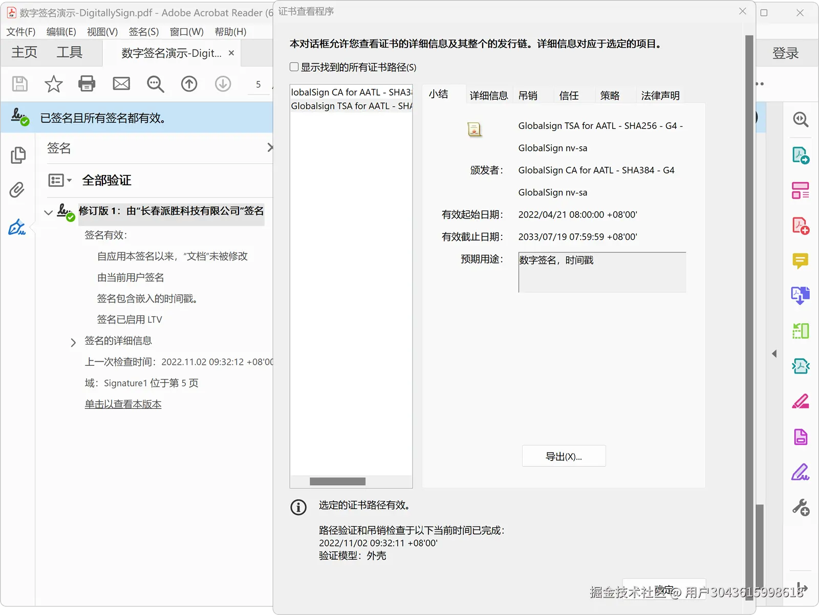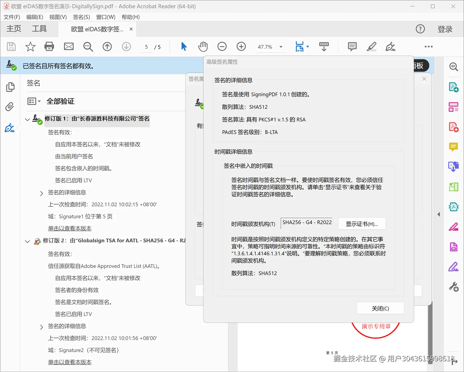 4.4 【演示】验证 PDF 数字签名的【签名算法】和【时间戳详细信息】。