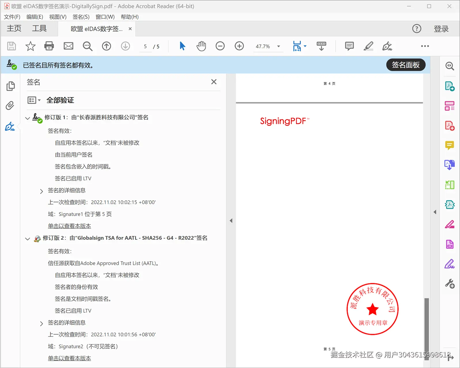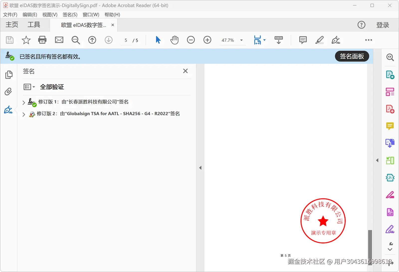 可信的PDF数字签名,签名面板自动显示【已签名且所有签名都有效】。
