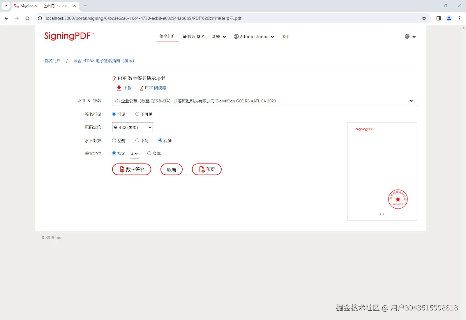 点击【预览】按钮,预览签名在 PDF 文档中的位置。