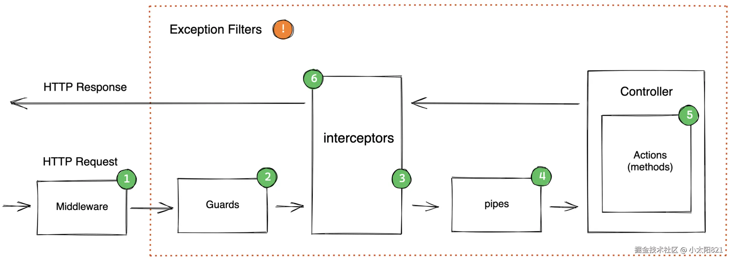 总结一下:nestjs是一款web框架,一个请求的流程:中间件--->守卫--->拦截器--->管道--->控制器--->拦截器--->响应