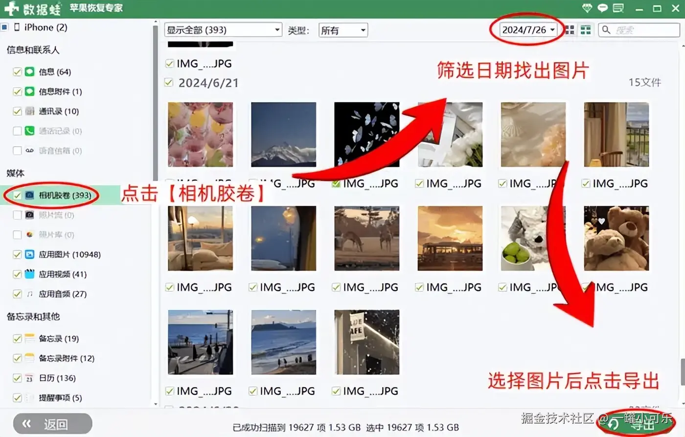 步骤3:查看应用栏,选择需要恢复的手机应用数据,如 【相机胶卷】 ,点击可恢复的相机照片,确认后导出,保存至电脑中即可。