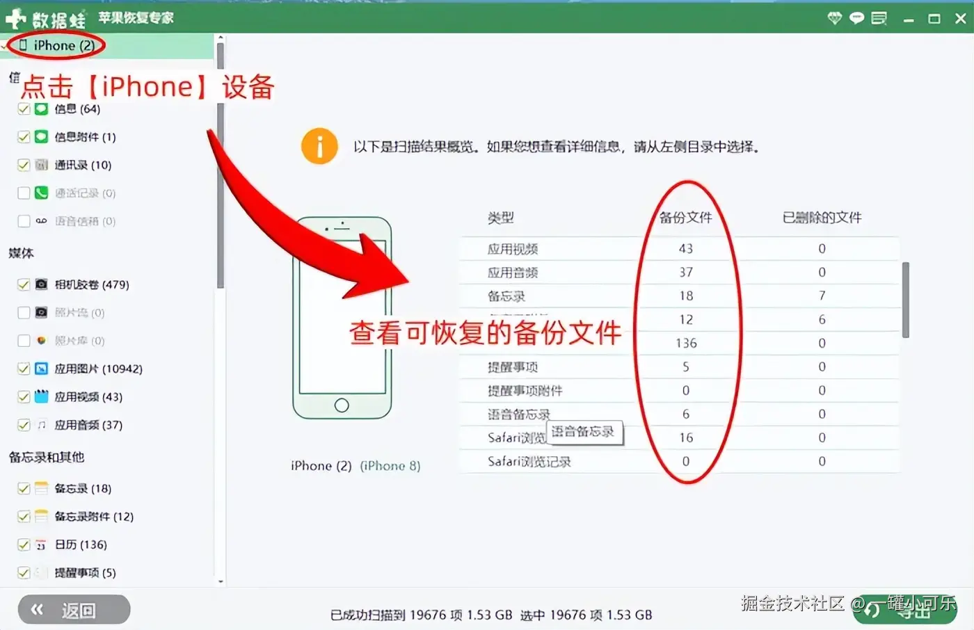 步骤2:数据扫描完成之后,点击iPhone设备标志,在显示的界面上,滑动滚条查看可恢复的备份数据。