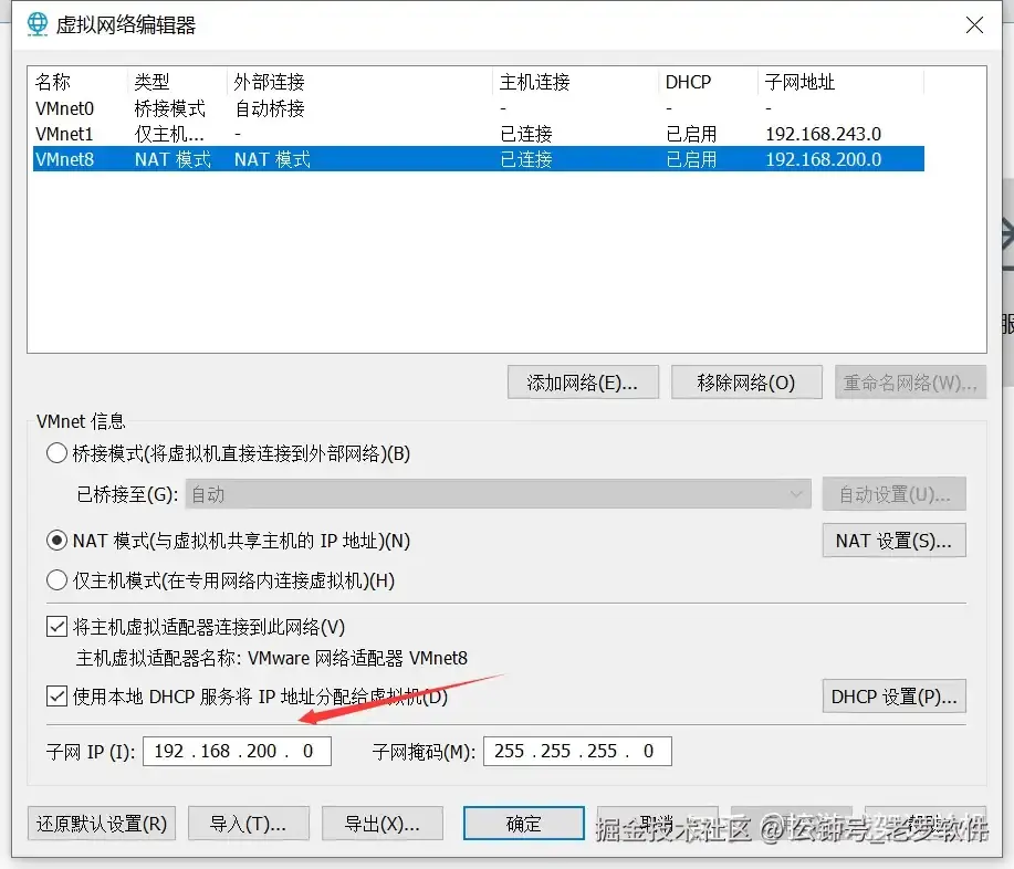 再次选择 VMnet8 ,子网ip改成 192.168.200.0 然后点击确定。