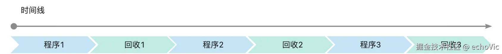 在这个示意图中,“程序”表示主程序的执行时间段,“回收”表示进行增量垃圾回收的时间段。由于垃圾回收被分割成多个小段,每段回收期间程序的暂停时间会减少,从而可以使程序的运行看起来更加平滑,避免了长时间的停顿。
