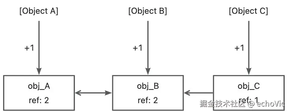 - obj_A 和 obj_B 互相引用,这造成了循环引用的问题,在只有引用计数的垃圾回收机制中,这会导致内存泄漏,因为他们的引用计数永远不会达到0。