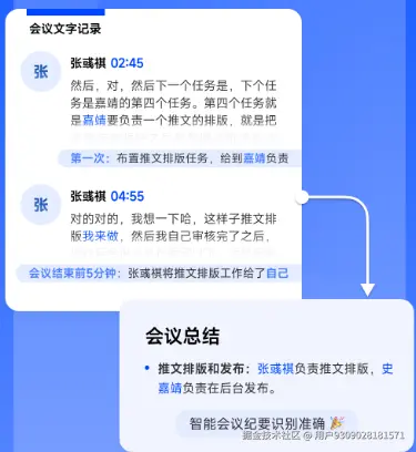 飞书智能会议纪要能够快速生成智能纪要,有多快呢,这边结束会议走出会议室,还没到工位就推送过来了。