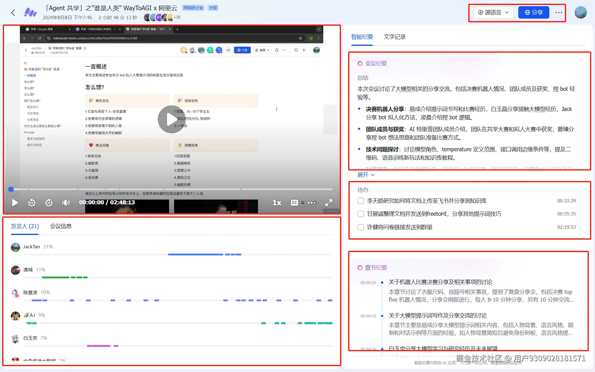 等网页直播完成之后,飞书智能会议纪要也就完成了,你可以看视频回放也可以看逐字稿,如果想快速了解直播会议的重点,飞书智能会议纪要已经将智能纪要帮你准备好了,很贴心。