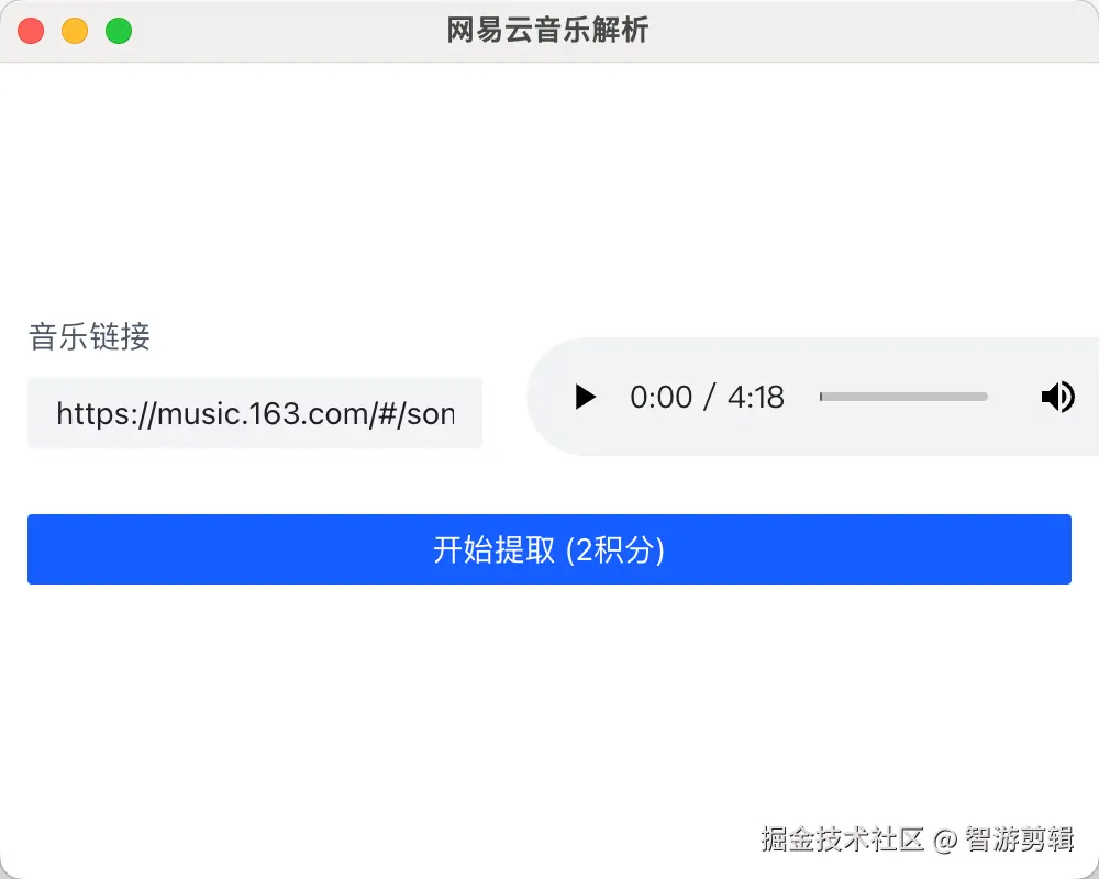网易云音乐解析 智游剪辑 2024-08-20 288 阅读1分钟 前面我们介绍了如何将ncm转换为mp3,但是有些时候我们只有一个音乐链接,这个时候要如何操作呢?今天教大家直接去解析网易云的音乐链接 首先我们打开网易云的音乐界面,复制一下地址栏里面的链接 然后我们打开智游剪辑(zyjj.cc)搜索网易云音乐解析 打开这个功能,直接把我们的地址给粘贴进去,然后点击开始提取就可以了