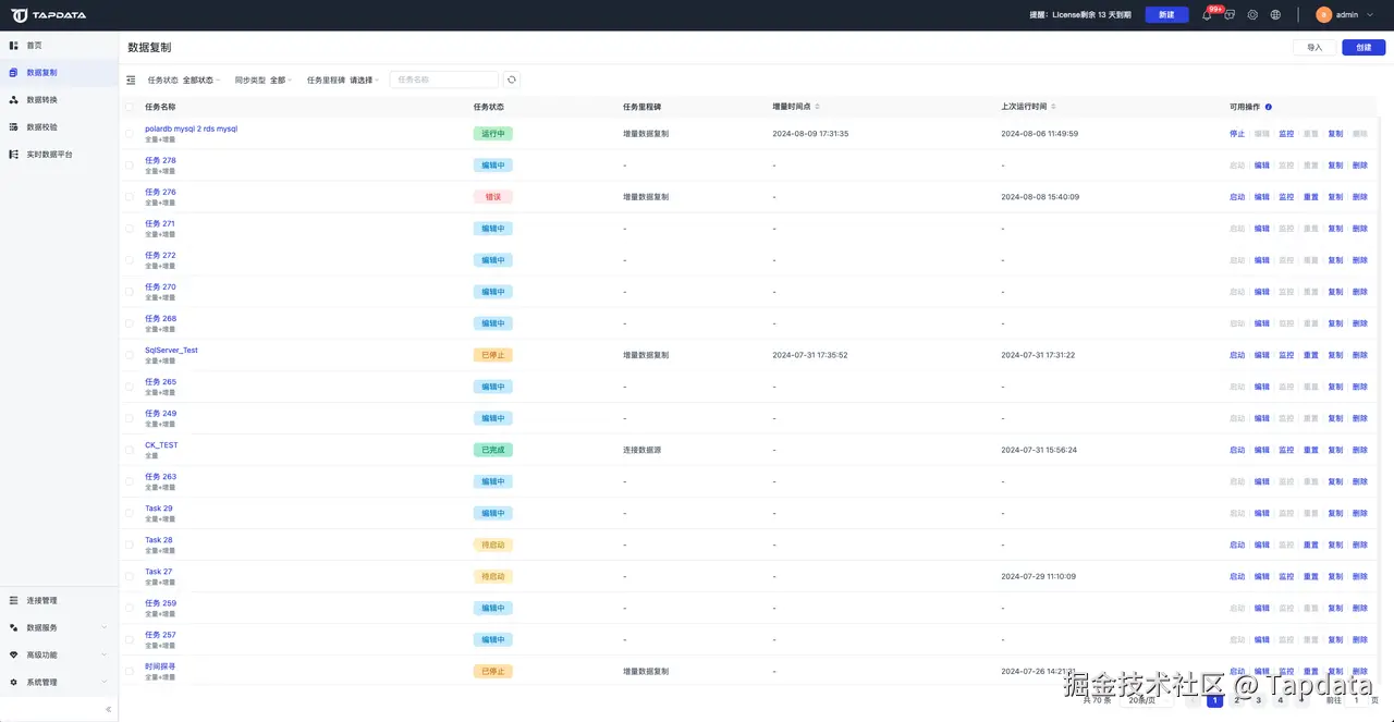 TapData 有完整的可视化监控界面,可以查看任务的执行状态,监控日志功能,查看异常错误日志信息。