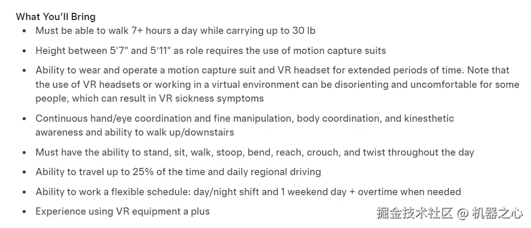 在国外,特斯拉在其人形机器人 Optimus 训练方面也有了新的消息。该公司正在招募人员穿上动作捕捉服来模仿预期动作,以获得所需的大量机器人训练数据。