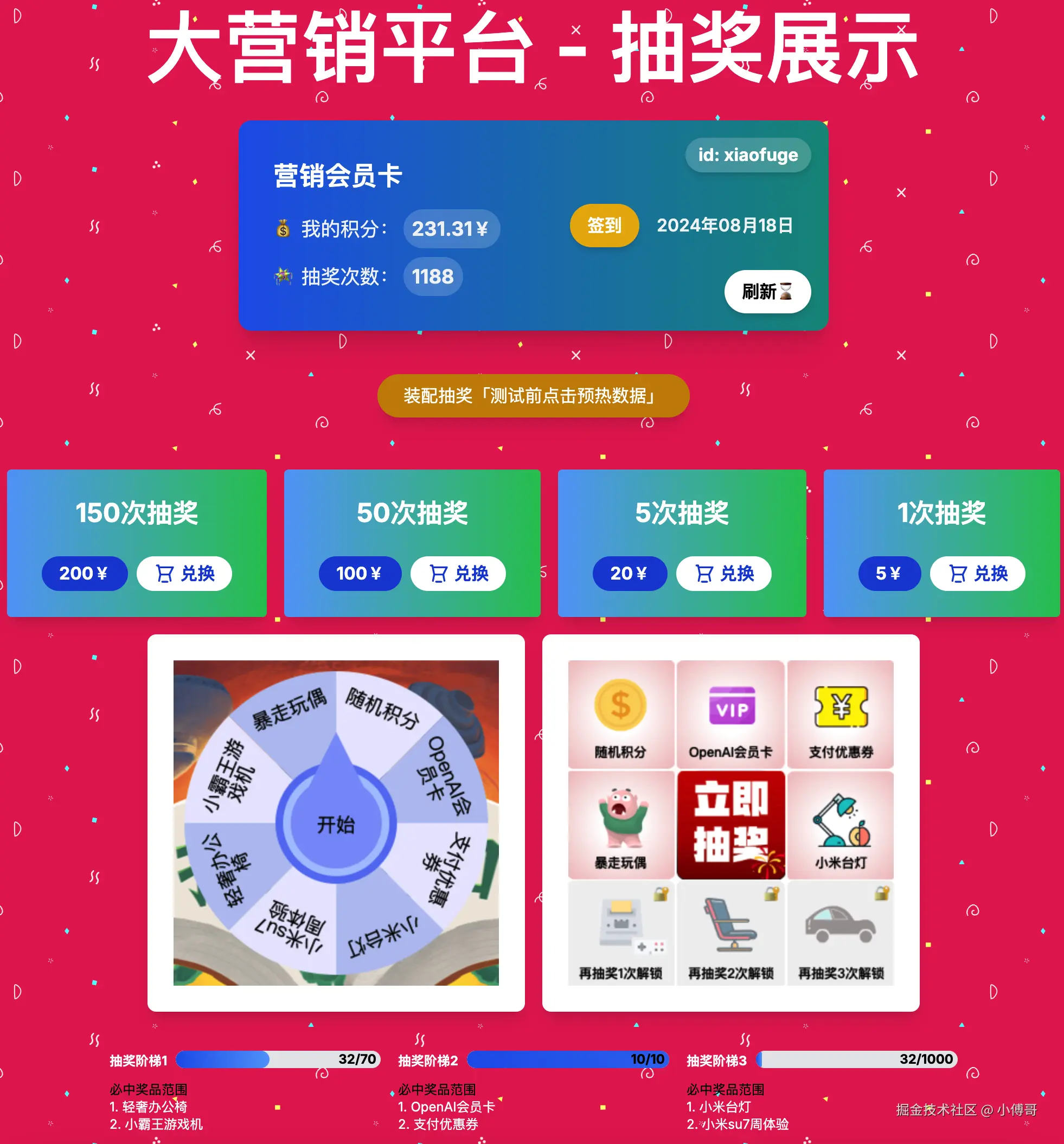 - 涵盖了互联网C端场景的多种玩法;积分、签到、兑换、抽奖、抽奖次数锁、抽奖阶梯/权重。