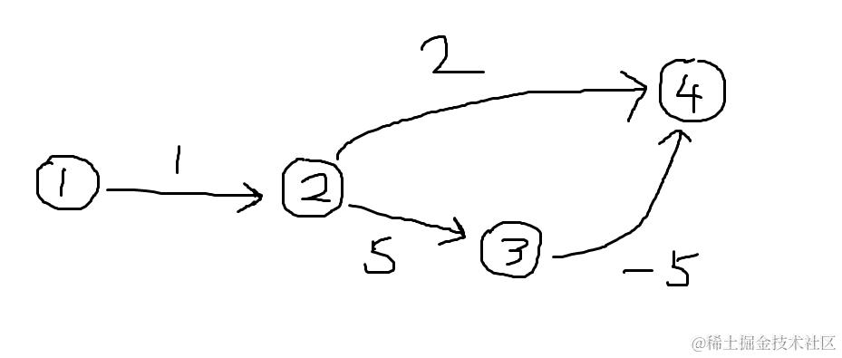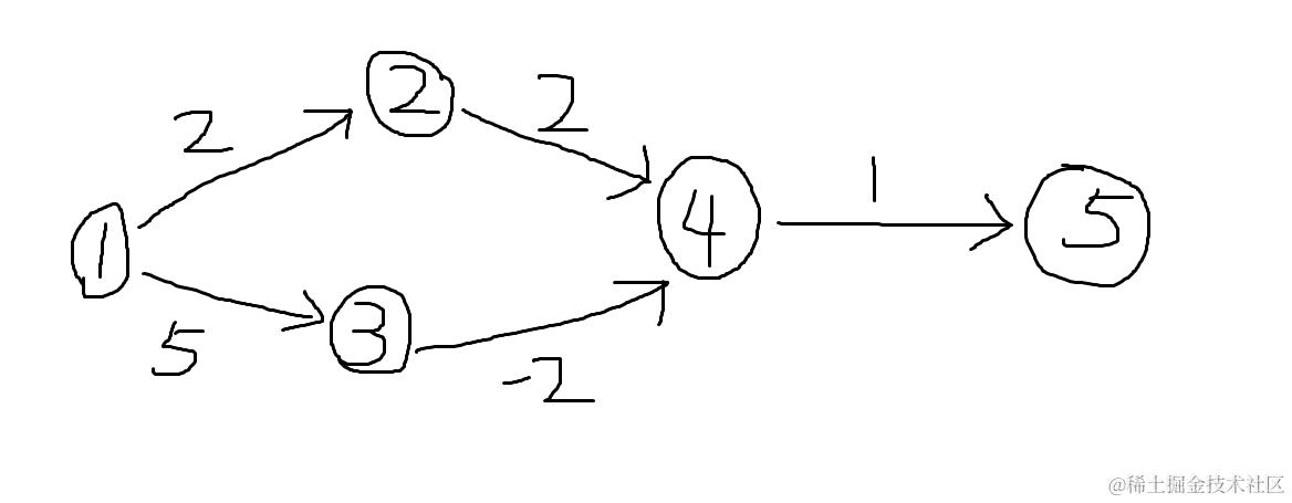 dijkstra算法在图中走出来的最短路径是1 -> 2 -> 4 -> 5,算出 1 号点到 5 号点的最短距离是2 + 2 + 1 = 5,然而还存在一条路径是1 -> 3 -> 4 -> 5,该路径的长度是5 + (-2) + 1 = 4,因此 dijkstra 算法失效