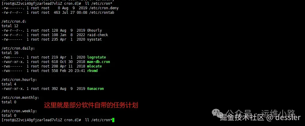 4.在前面讲文件搜索的时候,我们讲过Linux有自带的几个目录,里面放置的就是根据单词提示的执行任务。这里的任务,通过crontab -l命令都是看不到的。如果有任务计划未按照预期执行,可以检查cron.deny 。