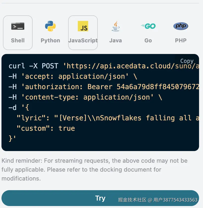 要使用 Suno Audios API,首先可以到 Suno Audios Generation API 页面点击「Acquire」按钮,获取请求所需要的凭证: