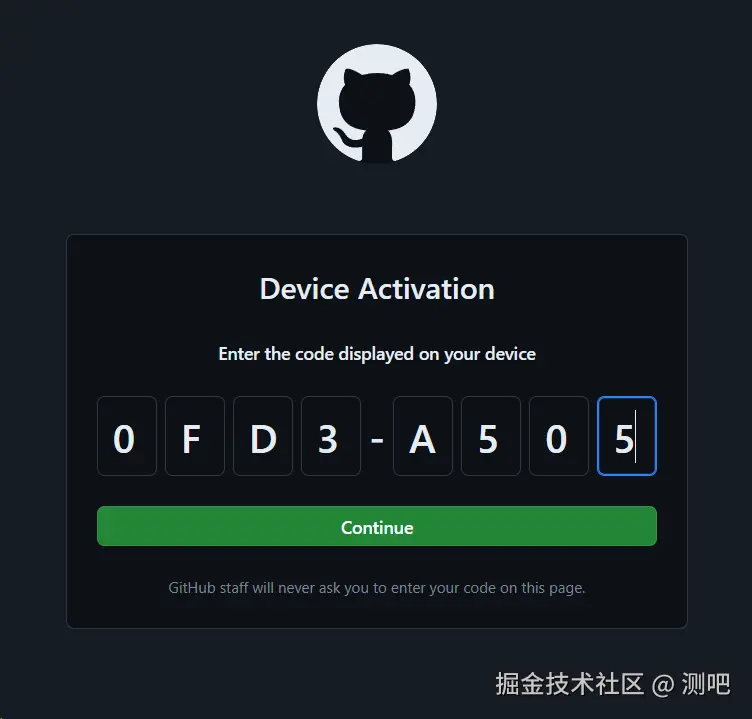 6、点击 copy and open,点击验证码粘贴到弹出的浏览器中,点击 continue 后,点击授权 Authorize GitHub Copilot Plugin。