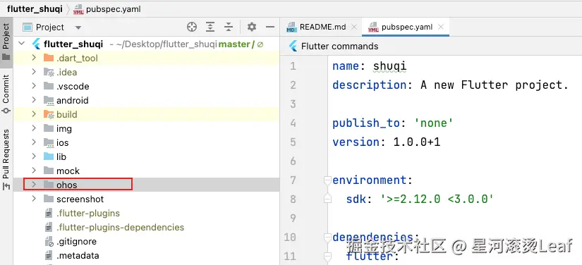 可能有些伙伴会有疑问,为什么把文件夹复制过来就可以正常运行了,那是因为我们目前使用的是鸿蒙提供了Flutter, 他们对Flutter Tools进行了修改,当使用flutter pub get、flutter run等命令。这些命令行的内部已经帮我们做了这些事情,他会去自动查找ohos目录,并生成相应的代码和.har包,从而确保可以支持鸿蒙系统。