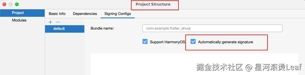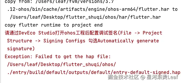这个时候,正常会报签名错误。看下面的截图可以发现,修复方式,就是使用DevDco Studio打开flutter_shuqi/ohos项目就行自动化签名即可。